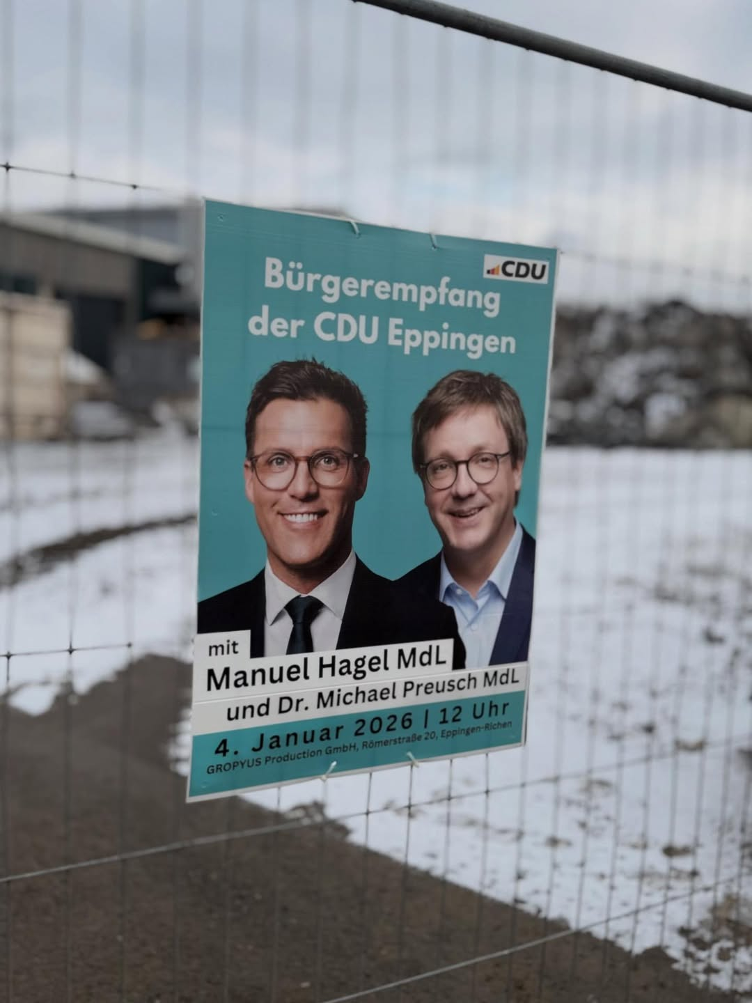 Der CDU Stadtverband Eppingen veranstaltete am Sonntag, dem 4. Januar 2026, seinen traditionellen Bürgerempfang in den Hallen der GROPYUS Production GmbH in Eppingen-Richen. Rund 250 Bürgerinnen und Bürger folgten der Einladung und nutzten die Gelegenheit zum persönlichen Austausch über aktuelle politische Themen im Vorfeld der Landtagswahl am 8. März 2026.